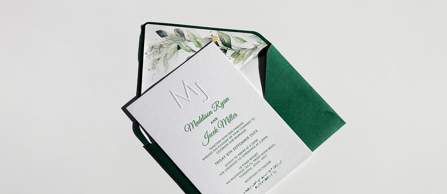 - Cotton Snow- Green Envelope & Liner- Green Letterpess- Blind Emboss